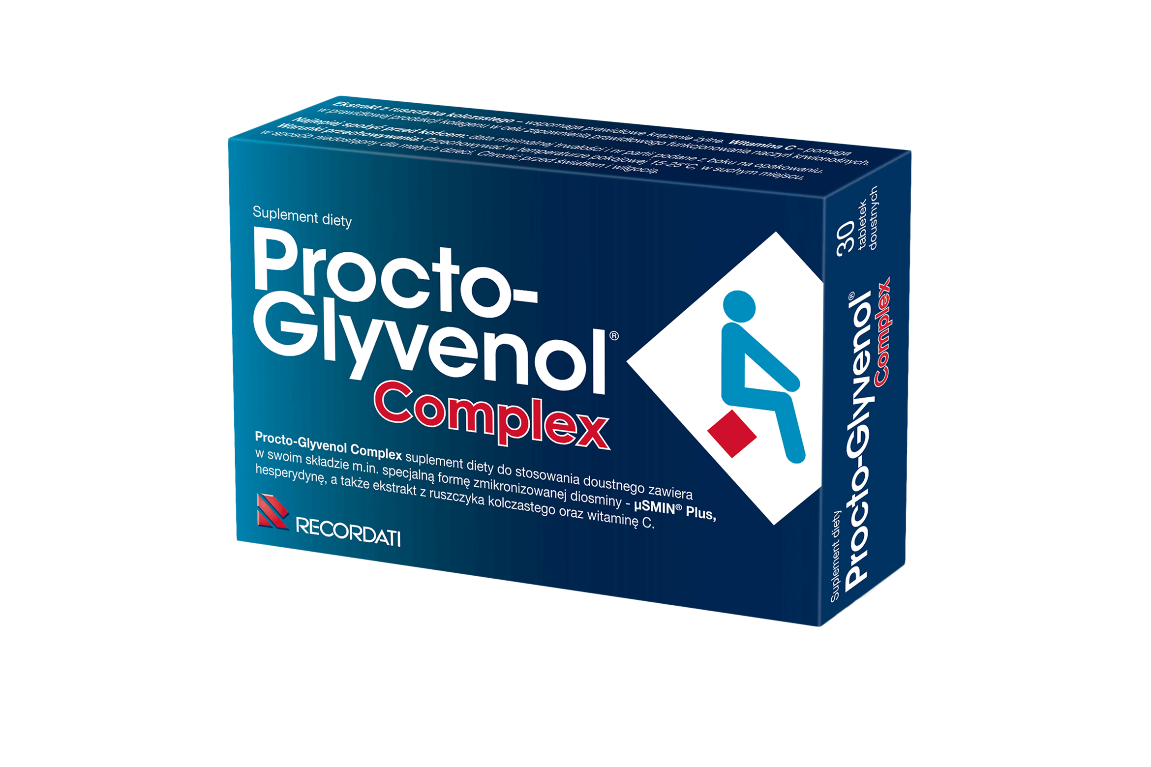 Procto-Glyvenol® Complex to suplement diety do stosowania doustnego, który zawiera w swoim składzie m.in. specjalną formę zmikronizowanej diosminy – μSMIN®Plus, hesperydynę, a także wyciąg z ruszczyka kolczastego oraz witaminę C.