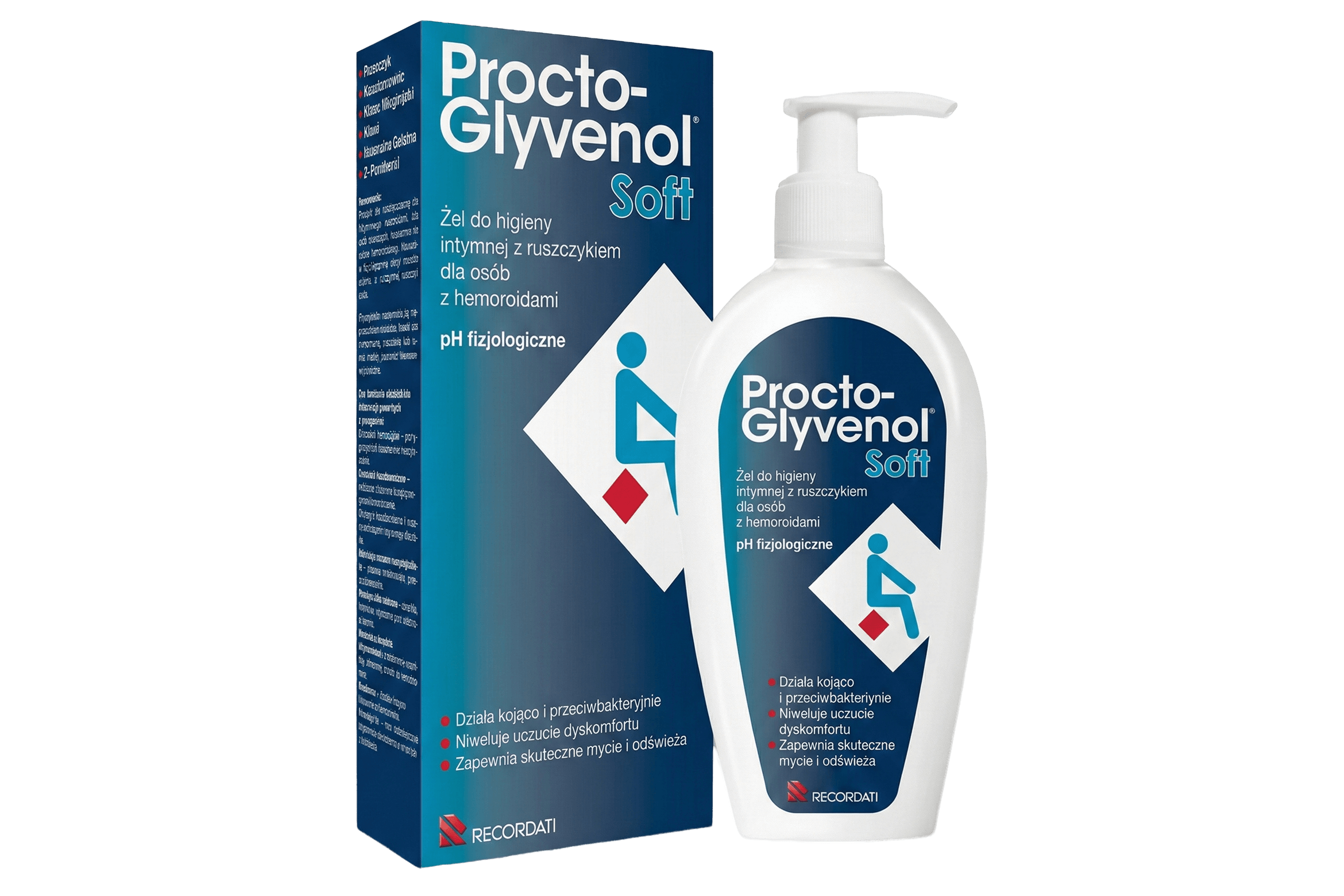 Procto-Glyvenol® Soft żel do higieny intymnej z ruszczykiem, dedykowany jest osobom z hemoroidami, które powinny szczególnie dbać o higienę i pielęgnację okolicy odbytu. Żel Procto-Glyvenol® Soft zawiera składniki łagodzące podrażnienia i zmniejszające uczucie dyskomfortu spowodowane stanem zapalnym. Specjalnie dobrany skład z wyciągami z ruszczyka, oczaru wirginijskiego i kasztanowca wspomaga odporność skóry, działając kojąco i przeciwbakteryjnie.